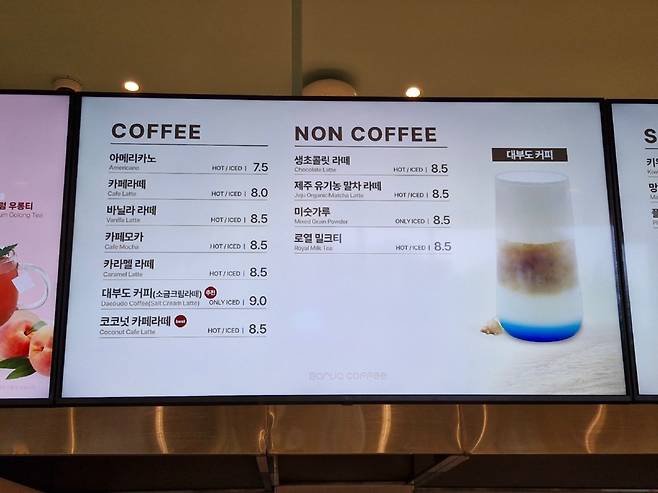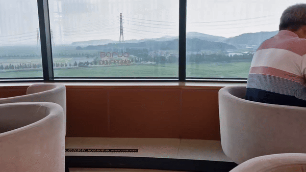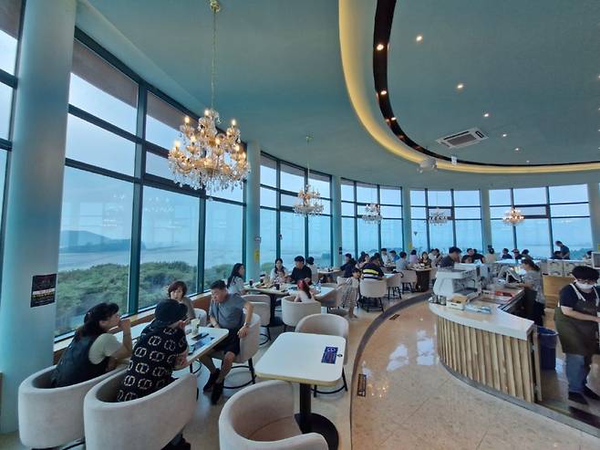 엘리베이터를 타고 올라가면 직원 안내에 따라 번호가 정해진 곳에 앉아야 한다. 창가 쪽 자리와 안쪽 자리가 있는데 복불복이지만 큰 상관은 없다. 360도 회전하는 카페이기 때문이다. 우린 창가 쪽이 다 차서 안쪽에 앉았는데 경치를 감상하는 데는 큰 무리가 없었다. 만약 안쪽 좌석에 앉았다가 창가 쪽 좌석에 앉고 싶으면 자리 안내해주는 직원분에게 미리 얘기하면 좌석이 비는 순서대로 이동할 수 있다.