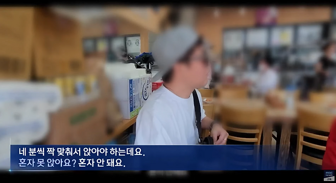 촬영자가 식당에 앉자 직원이 다가와 혼자서는 식사가 불가능하다고 말합니다. 직원이 "네 분씩 짝 맞춰서 앉아야 하는데요."라고 안내하자 유튜버는"혼자 못 앉아요?" 라고 답하자 직원은 "혼자 안 돼요."는 답변이 돌아왔습니다.