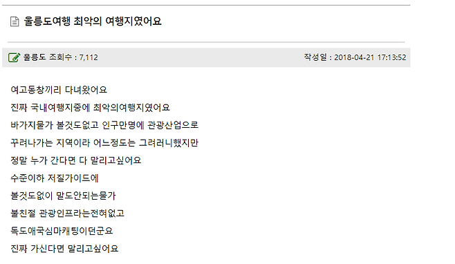 한 울릉도 여행 유투버는 "미안해하면서 안 된다고 할 수 있잖아요. 그냥 나가라고 하니까 서운하기도 하고 황당하기도 하고 화도 나고 그렇죠. 저도 다시는 갈 마음이 없어요." 라며씁쓸한 여행후기를 남겼습니다.