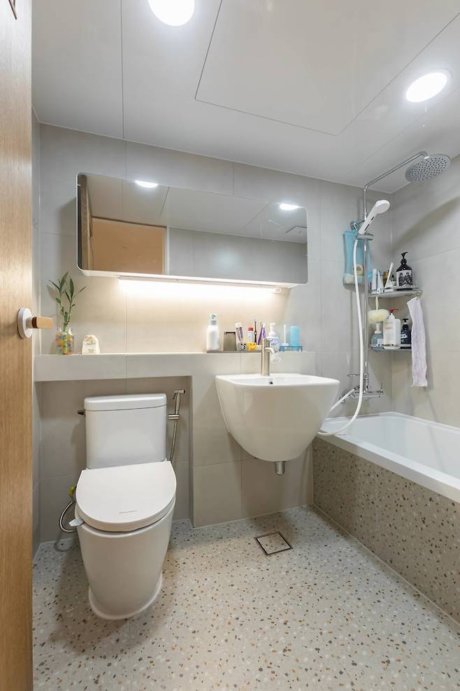 안방에 위치한 부부 욕실입니다. 공용 욕실보다 좁은 공간이기 때문에 도어를 여닫이로 하면 불편할 수 있습니다. 그래서 슬라이딩 도어로 시공하여 불편을 덜어드렸습니다 :) 탑볼형 세면대, LED 조명 거울을 배치하여 호텔처럼 보일 수 있게 시공했고요. 테라조 패턴의 300*600각 타일로 마감하여 트렌디한 느낌을 연출했습니다!