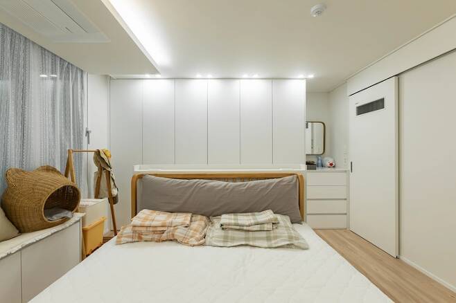 부부들의 안락한 휴식 공간, 안방입니다 :) 침대에 누웠을 때 눈부시지 않게 조명을 배치하여 피로감을 덜었고요. 거실과 동일하게 시스템에어컨을 설치하고 전체 매립 등과 간접 조명으로 넓어 보이는 효과를 냈습니다. 또한 고객님이 수납과 벤치가 필요하다고 하셔서 윈도우 시트를 배치해 드렸어요 :)