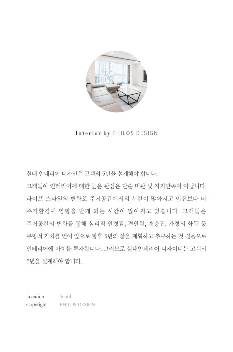 오늘 소개해 드린 후곡 2단지 동양대창아파트 시공 사례 어떠셨나요? 오늘 보여드린 현장처럼 고객님의 라이프스타일에 따라 공간의 용도, 가구 배치, 디자인 등이 달라지는데요. 필로스 디자인과 함께 자신만의 인테리어를 꾸며 보실까요? 이상으로 "공간의 가치를 더하다" 필로스 디자인이었습니다.