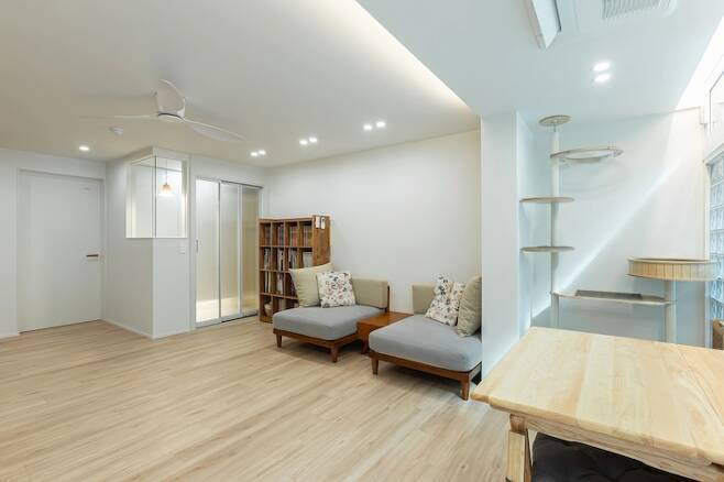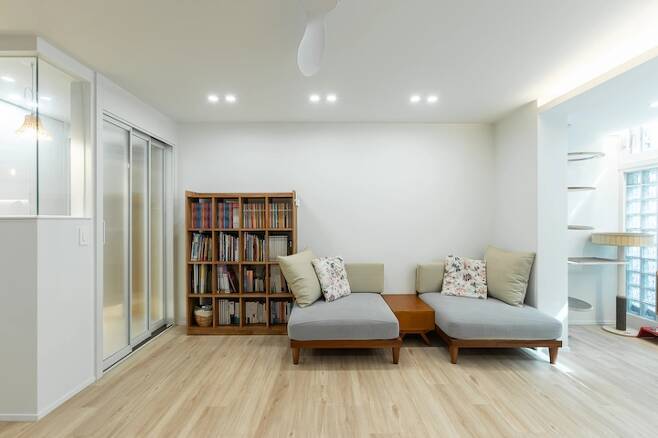 자녀분들이 햇빛을 받으면서 독서를 할 공간과, 고양이를 위한 캣타워 공간을 확보하기 위해서 거실 확장 공사를 진행하였어요. '나만의 집' 같은 디자인을 원하셨기에 일반적인 창이 아닌 다른 방법으로 시공했습니다! 그 방법은 유리블록입니다. 다양한 라운드 구성으로 자유롭게 꾸밀 수 있으며 개방감까지 주는데요. 채광도 좋으면서 사생활까지 보호되는 유용한 시공입니다 :)