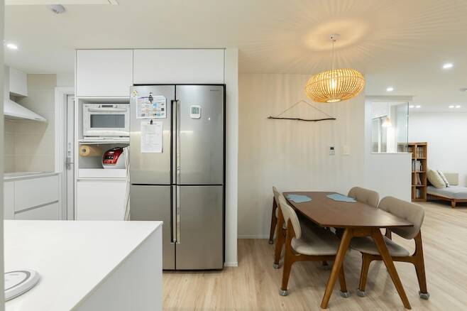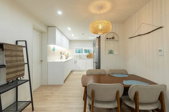 집에서 큰 부분을 차지하는 주방입니다. 2베이 구조의 아파트라서 고객님이 사용하시는 냉장고나 식탁 위치가 어중간했어요. 그 부분을 해결하고자 가벽을 설치해서 냉장고와 식탁 공간을 확보했습니다! 그다음 포인트로 매립 선반과 특색 있는 라탄 펜던트를 배치하여 포인트를 더했어요 :)
