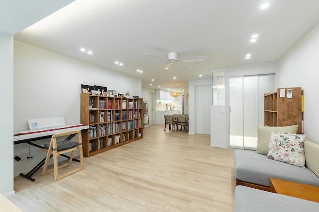 고객님의 가구와 조화롭게 디자인된 거실입니다. 가족분들이 거실에 모여서 대화를 나누거나 독서를 하신다고 하셔서 따로 tv를 배치하지 않고 가구들이 돋보일 수 있는 마감재를 선정했어요 :) 거실의 주용도가 독서와 소통 공간인 만큼 쾌적한 공간으로 만들어 드리고 싶었습니다! 실링팬을 통해 공기 흐름을 원활하게 하여 시원한 바람을 느낄 수 있게 했고요. 냉난방에 효과적인 시스템 에어컨을 배치했습니다!