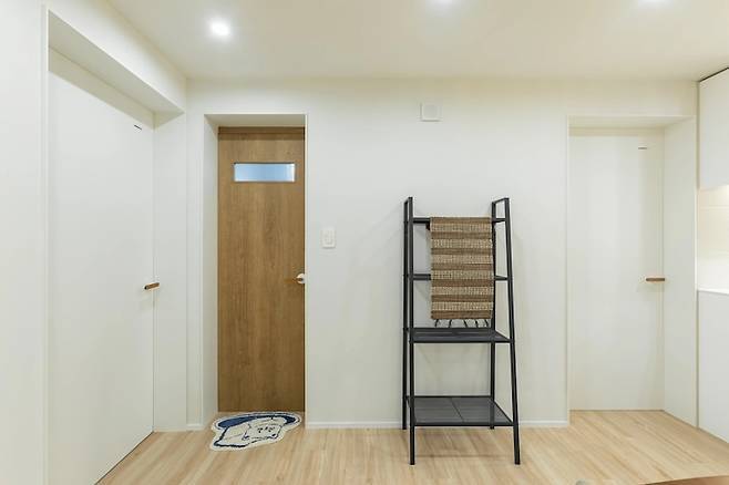 2베이 구조 상 현관 입구는 거실과 부엌 사이의 복도로 가는 경우가 대다수입니다. 그렇게 되면 현관문을 열었을 때 주생활 공간인 거실이 노출되어 사생활 침해가 우려되기도 하는데요. 그 부분을 개선하고자 현관 입구 방향을 정면이 아닌 좌측으로 변경하고 파티션을 세워드렸습니다! 그리고 모루 유리로 제작된 중문을 통해 이중으로 사생활 보호를 하고 외부 소음까지 차단했어요 :)