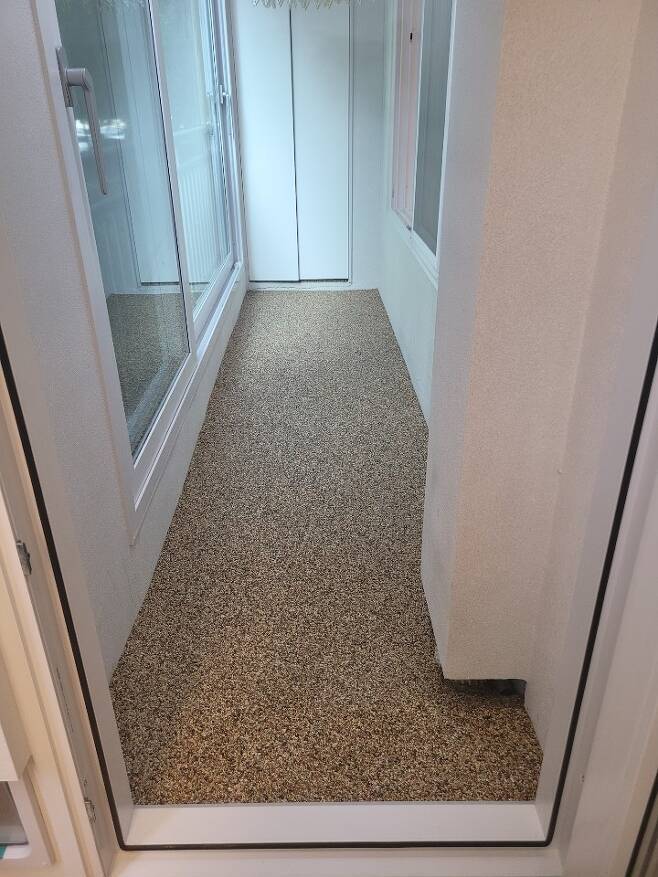 발코니는 고객님이 상담하실 때 요새 카페등 상업공간에서 바닥재로 쓰이는 콩자갈을 하고싶어라 하셔서 발코니에 콩자갈로 시공해드렸습니다~:)