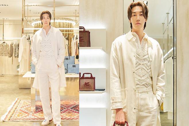 이날 김영광은 스트라이프 패턴이 포인트된 셔츠에 컬러풀한 하의를 매치했다. 여기에 두 가지 꼬임이 매치된 매쉬 벨트나 캐주얼 타이를 매치해 봄철 남성 패션에 별다른 액세서리 없이도 시크하고 캐주얼한 분위기를 연출할 수 있는 스타일링을 제안했다.