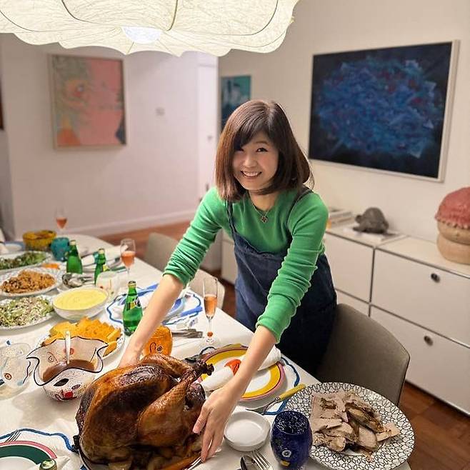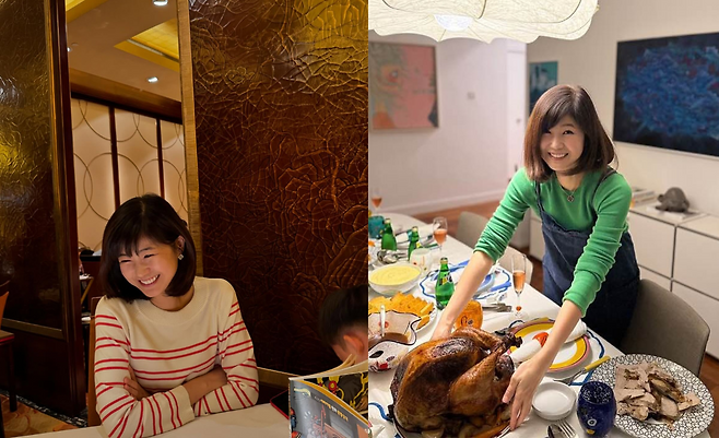 네 번째 사진에서 강수정은 밝은 초록색 니트와 네이비색 앞치마를 매치해 캐주얼하면서도 실용적인 홈파티 스타일을 완성했다. 초록색 니트는 따뜻한 분위기를 자아내며, 앞치마는 요리를 준비하는 상황과 잘 어우러진다. 테이블 위의 화려한 식기들과 조화를 이루며, 전체적으로 편안하면서도 세련된 느낌을 연출하고 있다.