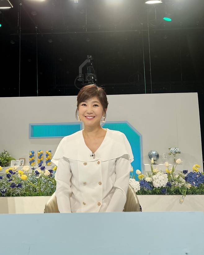 첫 번째 사진에서는 강수정이 방송 스튜디오에서 화이트 더블 버튼 블라우스를 착용해 단아한 이미지를 강조했다. 블라우스의 독특한 칼라 디자인과 금색 버튼 디테일은 고급스러운 분위기를 더하며, 배경의 화려한 꽃 장식과 어우러져 화면 속에서 돋보이는 스타일을 완성했다. 액세서리를 최소화하여 깔끔함을 유지한 점도 주목할 만하다.