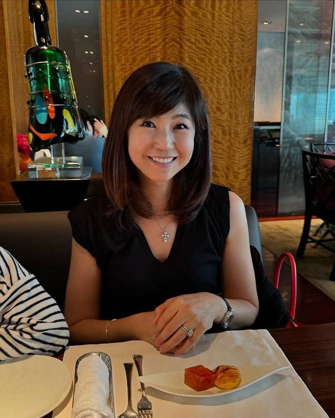 두 번째 사진에서 강수정은 블랙 슬리브리스 탑과 십자가 펜던트 목걸이를 매치해 우아하면서도 시크한 레스토랑 룩을 선보였다. 블랙 컬러는 차분하면서도 세련된 느낌을 주며, 실버 액세서리가 포인트 역할을 한다. 테이블 위의 디저트와 조화롭게 어우러져 고급스러운 분위기를 연출하고 있다.