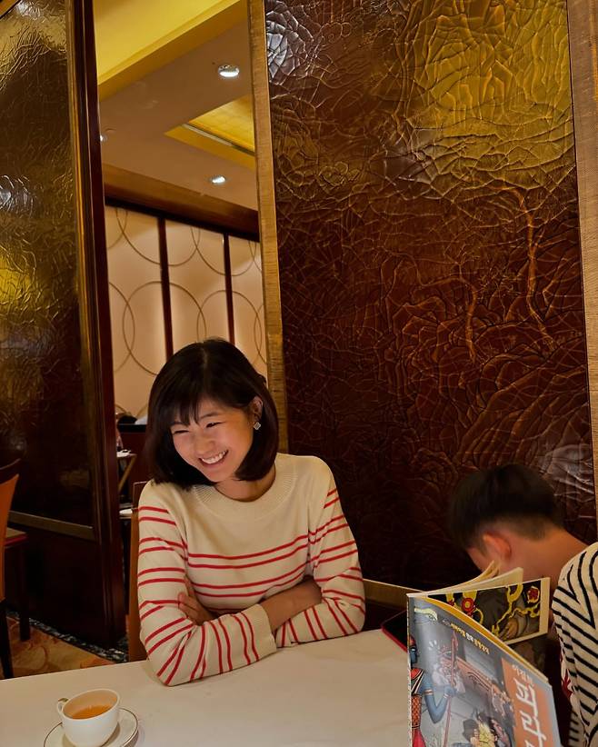 세 번째 사진에서는 강수정이 레드 스트라이프가 들어간 크림색 니트를 착용해 편안하고 따뜻한 외식 스타일을 보여주고 있다. 스트라이프 패턴은 캐주얼하면서도 생동감을 더하며, 주변 인테리어와 자연스럽게 어우러진다. 심플한 귀걸이로 포인트를 주어 과하지 않은 세련미를 유지하고 있다.