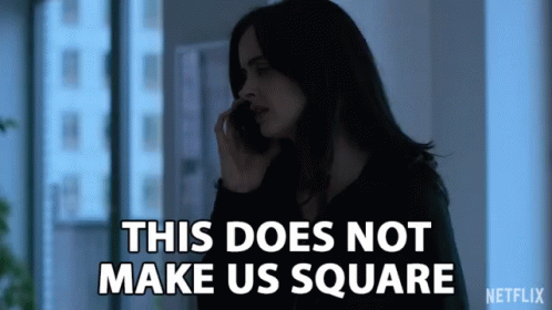 “This does not make us square”라고 되어있지? 저 이미지가 나온 넷플릭스 드라마에서, 저 배우에게 뭔가 악한 짓을 한 사람이 있어. 그 사람과 통화하는 도중에 나온 말인데, 좀더 자세하게 풀이해보면 “이걸로 네게 받아야 할 걸 다 받았다고 생각하지 않아” 정도의 의미를 갖게 돼!