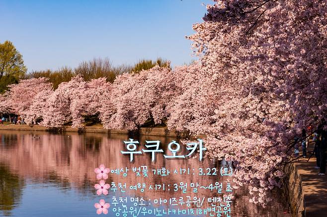 다른 일본 벚꽃 명소와 마찬가지로 3월 중순을 시작으로 4월 초에 벚꽃이 만개 한다는 예상을 하고 있으며 참고해서 여행 계획을 세우시기 바랍니다.