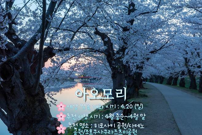 일본 북부에 위치한 2025 아오모리 벚꽃 개화 시기는 4월 20일경으로 발표됐습니다. 추천 여행 시기는 4월 중순부터 말까지입니다. 일본 3대 벚꽃 명소 중 하나인 아오모리 히로사키 공원은 약 2,600그루의 다양한 벚나무가 있어 화려한 벚꽃 경관을 자랑하는데요.