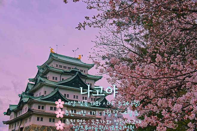 나고야 벚꽃 개화 시기는 3월 24일로, 한국인이 많지 않은 숨은 일본 벚꽃 명소라할 수 있습니다. 적절한 대도시급 규모와 나고야로 가는 직항이 있기 때문에 조용하게 벚꽃을 즐기고 싶은 분들에게 추천한느 일본 여행지인데요.