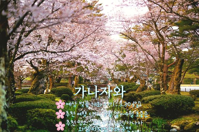 인천-하네다-가나자와 경유를 통해 방문할 수 있으니, 한국인이 없는 일본 벚꽃 명소를 찾고 계신다면 적극 추천해 드립니다.