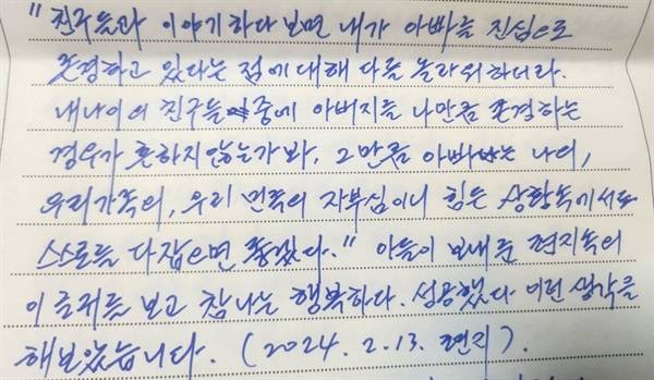 결국 수의 대신 선거운동복을 입고 옥중 촬영을 하셨다. 선거기간 내내 서구갑 시민들께 후보의 모습을 보일 수 없을까 싶어 걱정이 많았는데 이렇게 연설 방송이나마 나가게 되어 다행이고, 재판부가 아버지의 참정권 보장을 위해 남은 선거기간 동안이라도 석방해주길 바라는 마음이다."