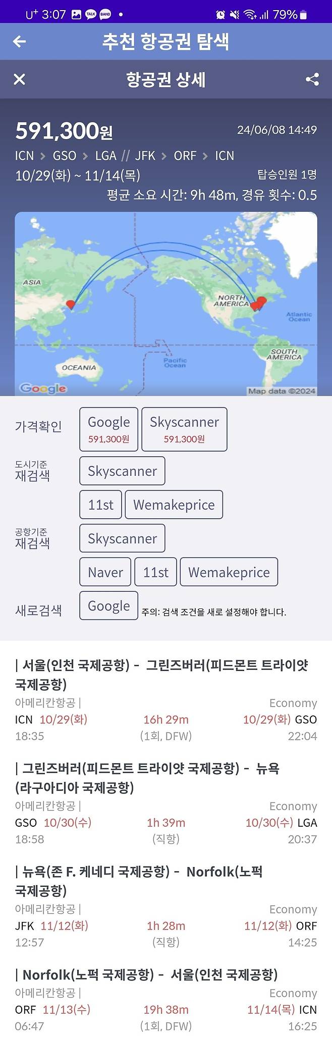 11/12 뉴욕(jfk) 출발 - 노퍽(dfw) - 인천 인