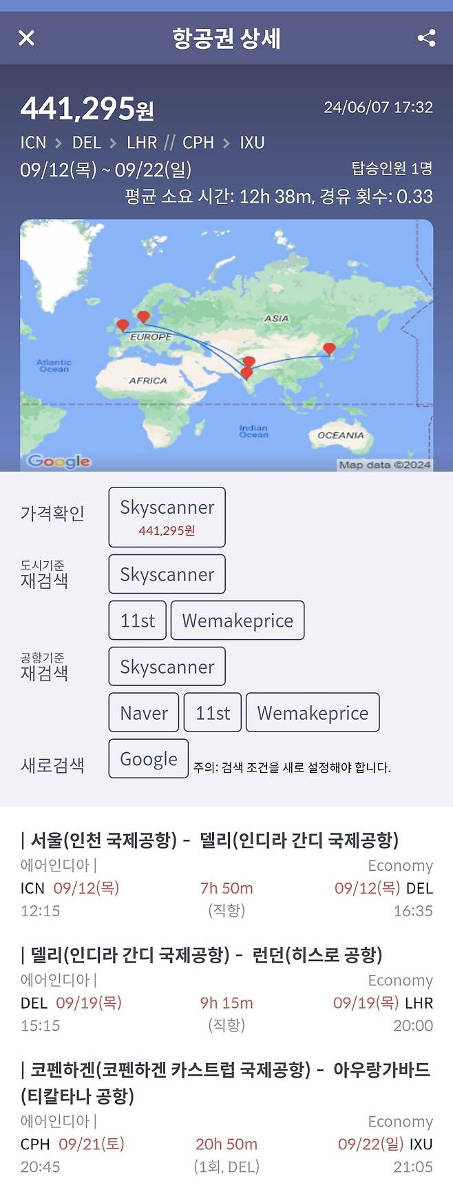 9월 12일 인천 - 델리 경유 - 런던 이고