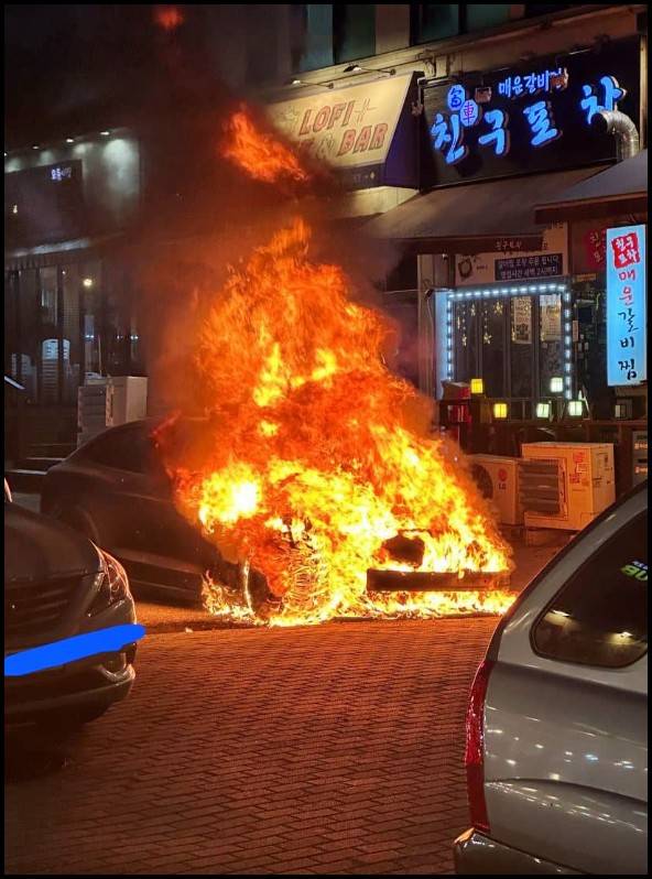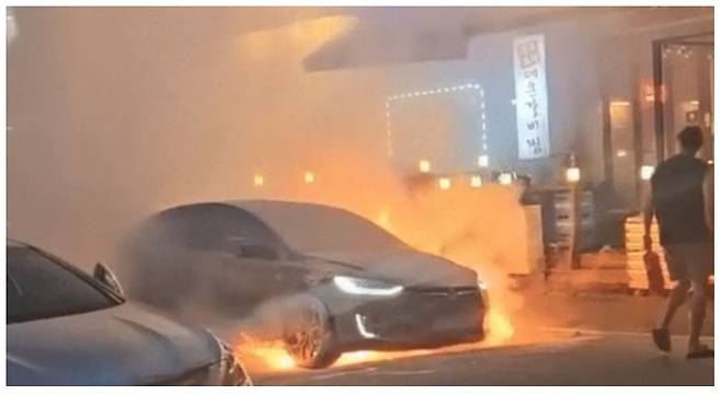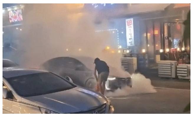 전기차 차바닥에서 연기날 때 소화기 쏴도 소용없었다