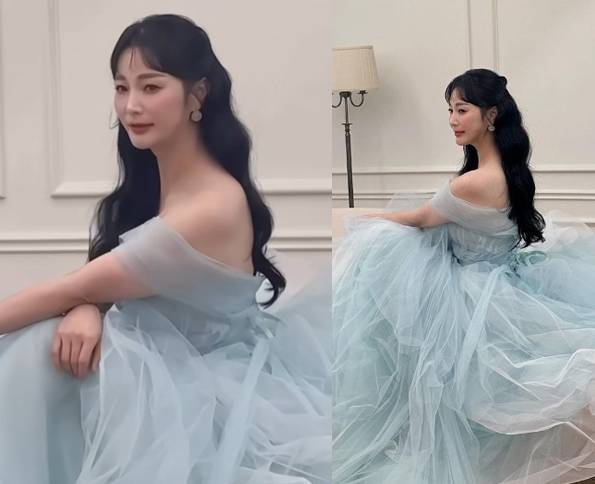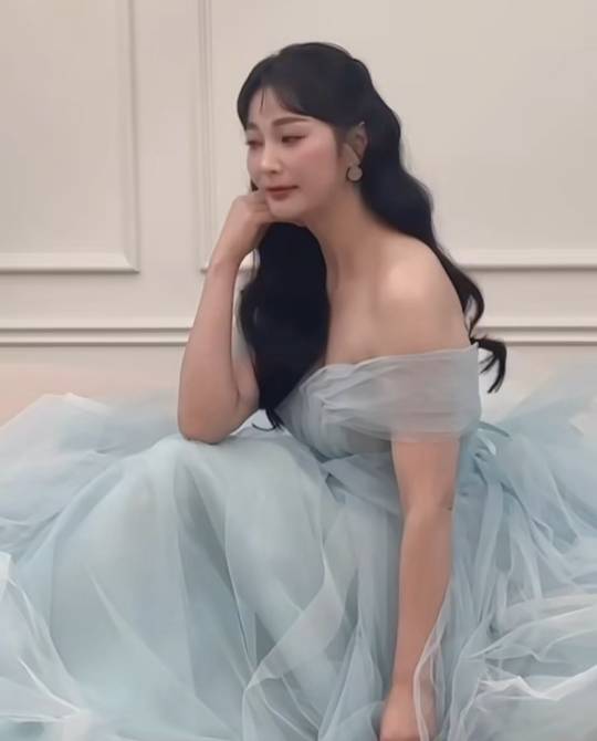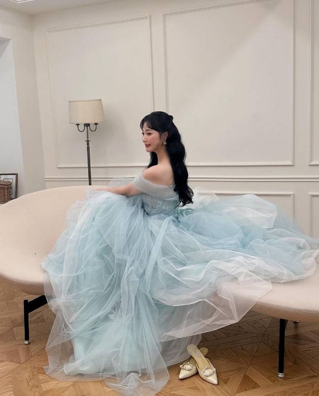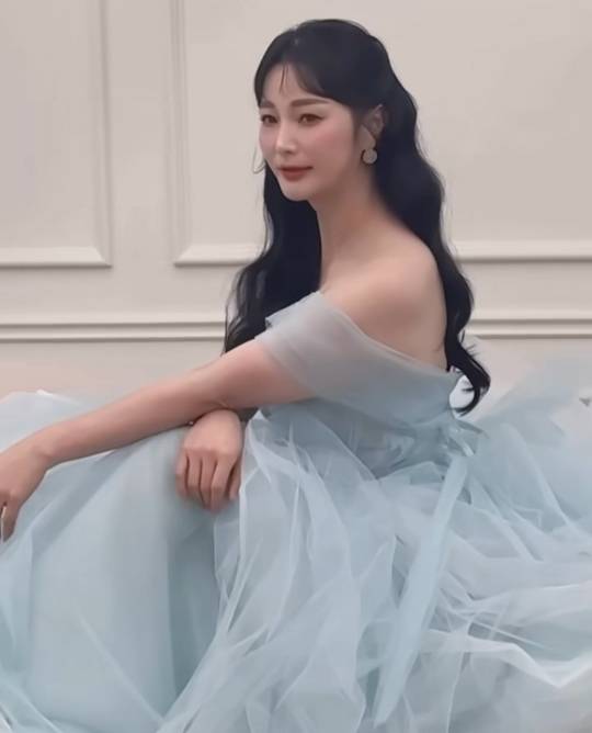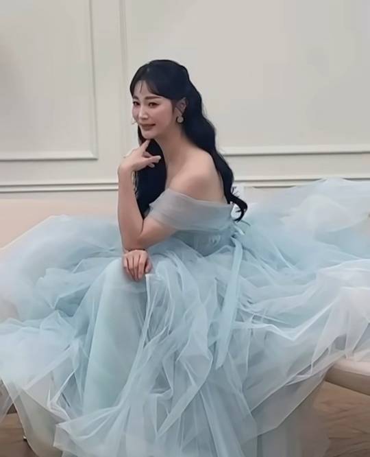 안혜경은 부드러운 파스텔 톤의 블루 드레스를 입고 환상적인 분위기를 자아내며 아름다운 미모를 뽐냈습니다.
