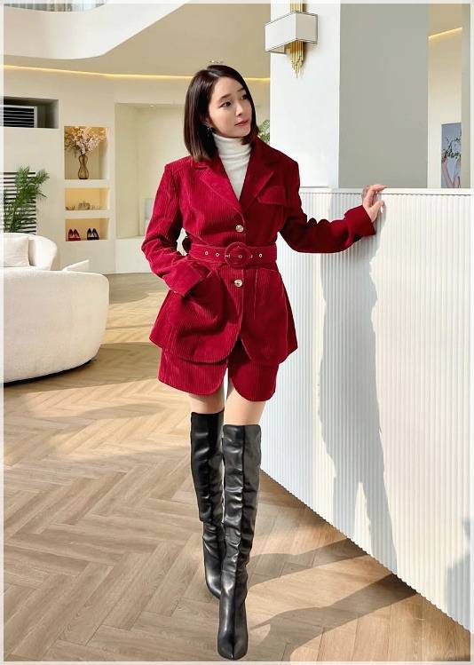 일반인이 소화하기 힘든 올 레드 셋업도 그녀는 롱부츠를 더해 우아한 무게감을 더했습니다. 평범한 그레이 니트도 패턴감이 강한 디자인을 선택하여 연말 주인공 같은 스타일을 연출했습니다. 과감하면서도 세련된 스타일 감각이 돋보입니다.