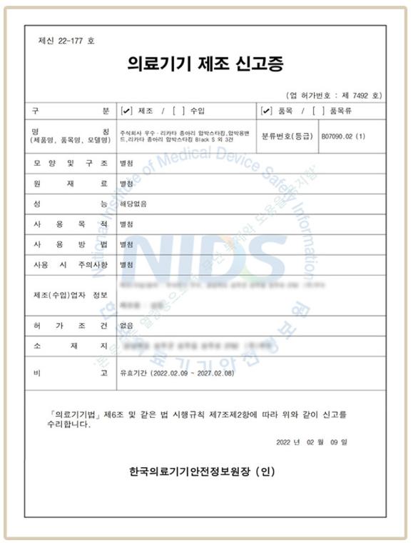 * 의료기기 제조 신고 번호 제신 21-1168 호