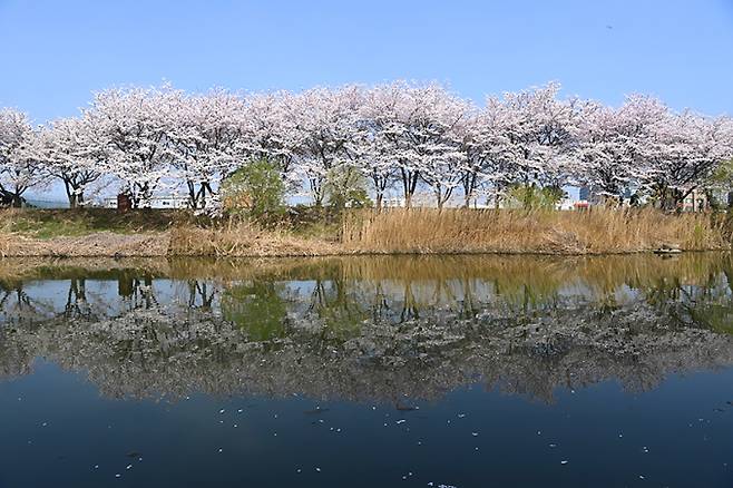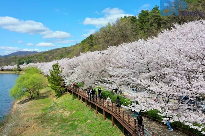 저수지 주변을 한 바퀴 돌면서 데크의 반대편에 펼쳐진 벚꽃 길을 멀리서 바라보는 것도 이곳만의 특별한 즐거움 중 하나입니다.