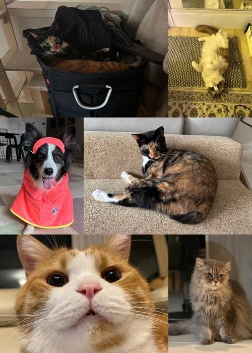 가족이 많은 만큼 함께 하면서 행복해하며 웃을 일도 많다며 “훈이는 손, 앉아, 엎드려, 돌아 등 기본적인 훈련은 다 잘 되어 있으나 많이 산만한 편이다. 나나는 기본적인 훈련을 했을 때 다 알아듣지만 어릴 때부터 고양이와 자란 탓인지 기분에 따라 응해 주는 편이다”라고 반려동물의 성격과 장기를 자랑했는데요.