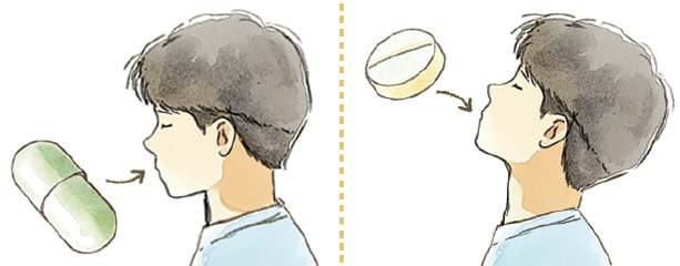 약 모양에 따라 삼키는 요령이 다르다. 캡슐은 고개를 숙인 상태에서 삼키는 게 낫다. 동그란 알약은 고개를 들고 삼키는 게 편하다.