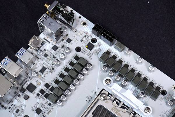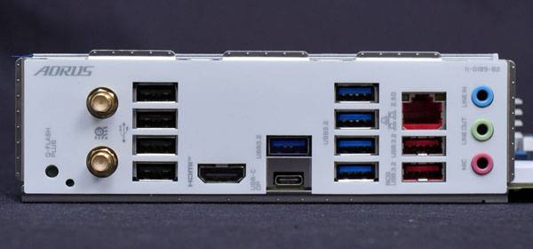 또한 Wi-Fi 6E 지원 무선 안테나 커넥터, 4개의 USB 2.0 포트, 내장 그래픽을 위한 HDMI 출력 포트, 5개의 USB 3.2 Gen1 Type-A 포트와 2개의 USB 3.2 Gen2 Type-A 포트, 1개의 USB 3.2 Gen2 및 DisplayPort 출력 지원 Type-C 포트, RJ-45 2.5GbE LAN 포트, 3개의 오디오 잭이 들어간다.