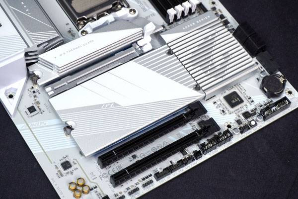 2개의 M.2 히트싱크 가운데 상단 PCIe 5.0 지원 M.2 슬롯에는 히트싱크 면적을 늘리고 멀티컷 디자인을 적용해 9배 최적화된 열 방출이 가능한 M.2 써멀 가드 XL를 탑재했으며, 하단에 있는 2개의 M.2 슬롯은 넓직한 1개의 M.2 써멀 가드로 고사양 그래픽 카드 장착에도 방해받지 않으면서 효율적인 M.2 SSD 쿨링을 할 수 있다.