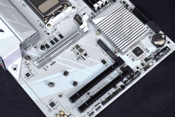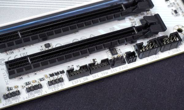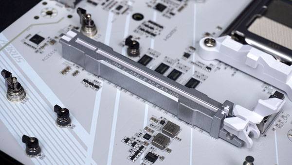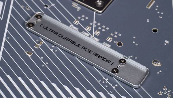 PCIe 5.0 x16 확장 슬롯에는 크고 무거운 고사양 플래그십 그래픽 카드까지 안전하게 사용할 수 있도록 강도를 높인 PCIe UD(Ultra Durable) 슬롯 X를 도입했다. 일반 PCIe 슬롯 외부에 메탈 커버를 적당히 두른 방식이 아니라 이음매 없는 일체형 디자인은 물론 메인보드 후면에서 전용 백플레이트에 나사로 고정시켜 10배 강한 내구성을 제공한다. PCIe 내벽에는 고무 스트립을 사용하여 그래픽 카드의 PCB가 긁히지 않도록 보호하며, 아연 합금을 써서 고속 신호에 대한 효과적인 전자파 차폐도 가능하다.