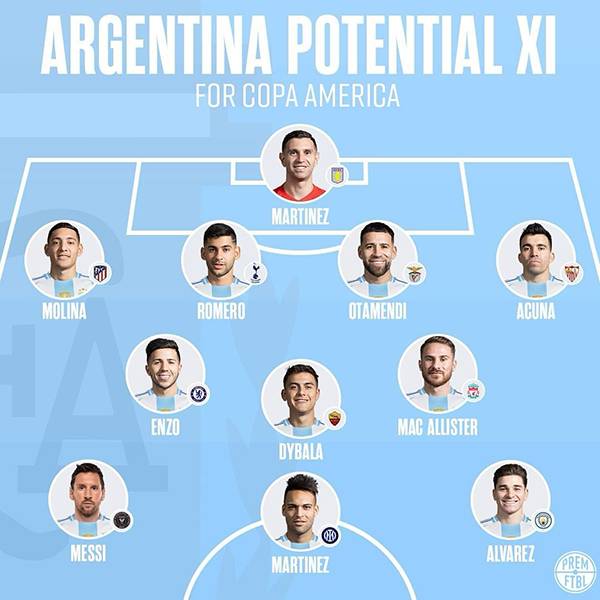 축구 콘텐츠 제작소 'premftbl'은 16일(한국시간) SNS를 통해 아르헨티나의 2024 남미 축구 연맹(CONMEBOL) 코파 아메리카 예상 라인업을 공개했다.