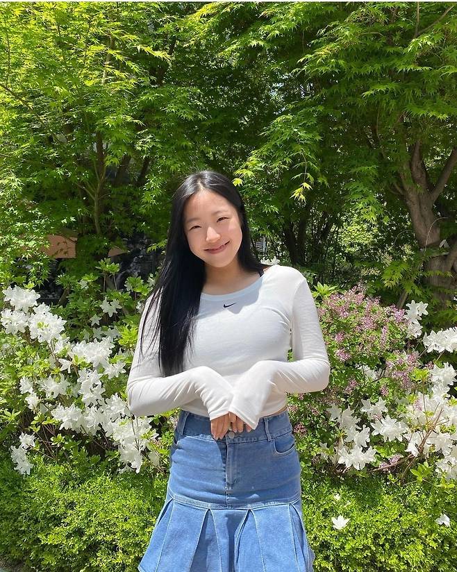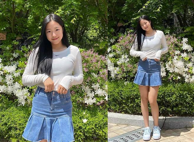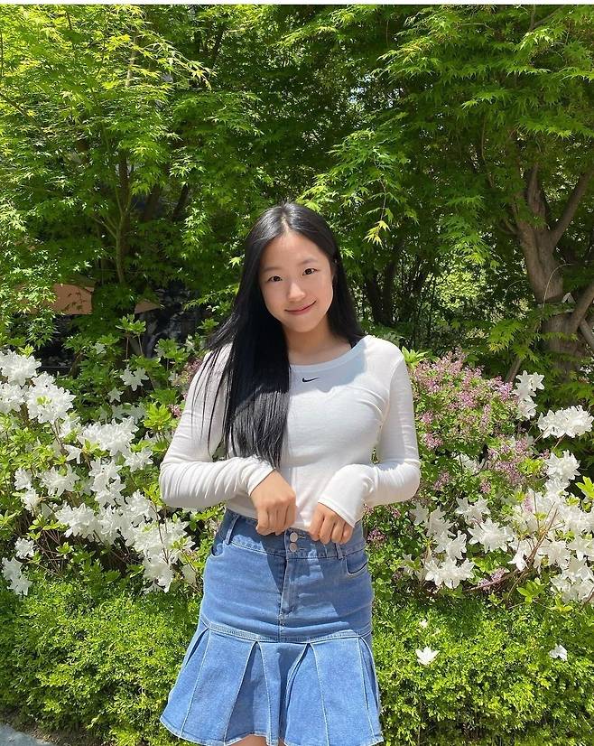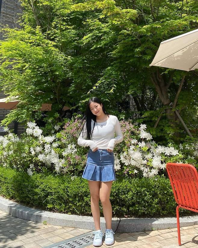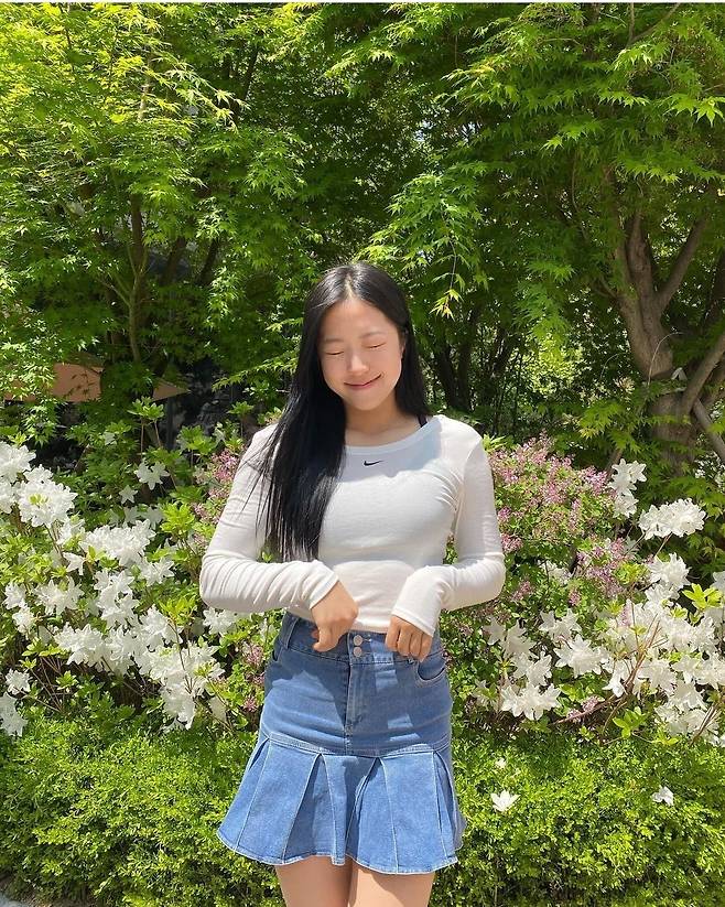 또, 신유빈은 데님 플리츠 미니스커트를 착용해 청순하고 활기찬 분위기를 자아냈습니다.