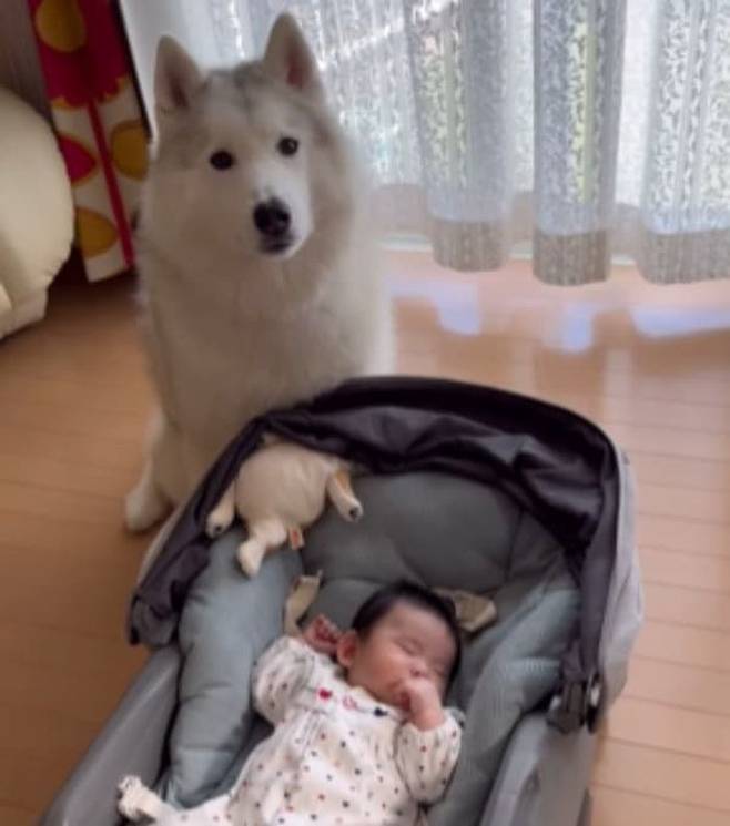 사연은 이렇습니다. SNS상에는 유모차에서 잠든 아기 앞에 자리를 잡고 앉아 지켜주는 시베리안 허스키 강아지 일상이 올라왔죠.
