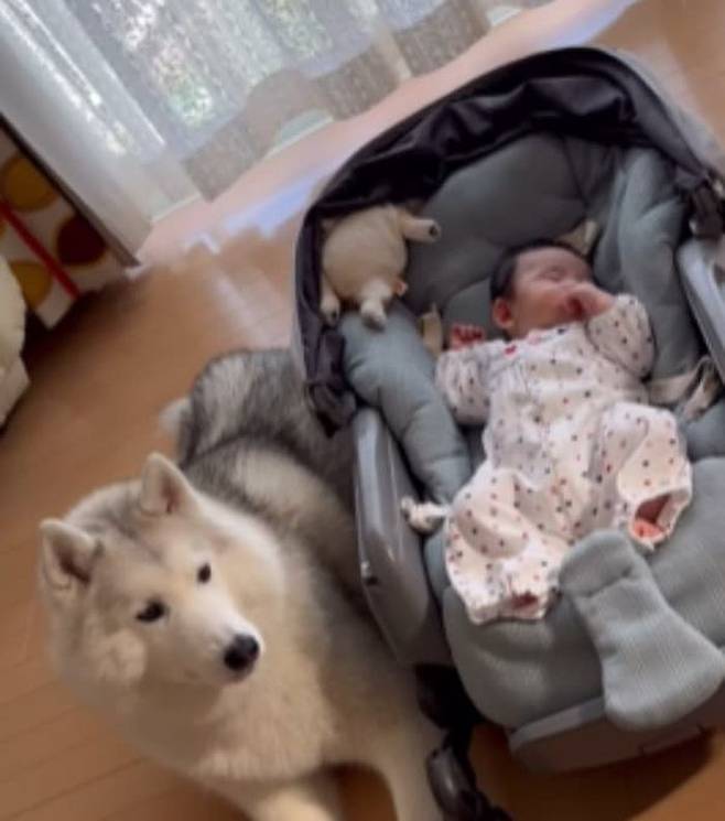 멀리서 보면 시베리안 허스키 강아지가 잠든 아기를 지켜주는 듯 보였는데요. 누가 봐도 아기를 사랑하는 강아지의 모습이었습니다.