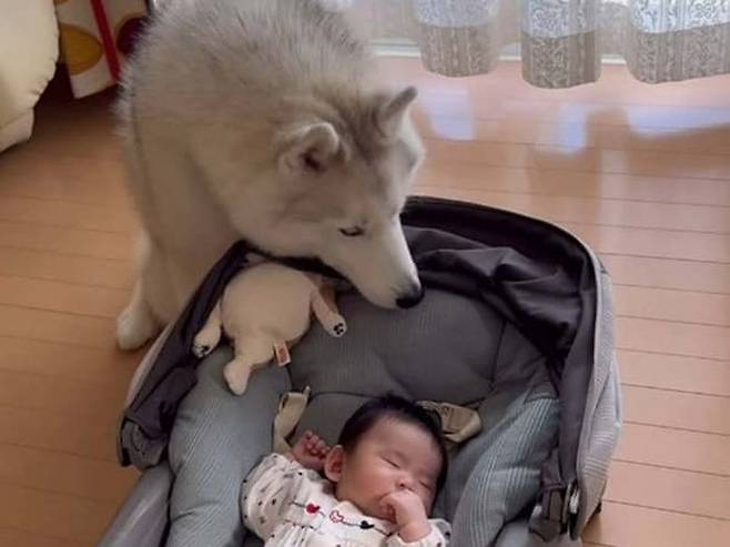 멀리서 보면 시베리안 허스키 강아지가 잠든 아기를 지켜주는 듯 보였는데요. 누가 봐도 아기를 사랑하는 강아지의 모습이었습니다.