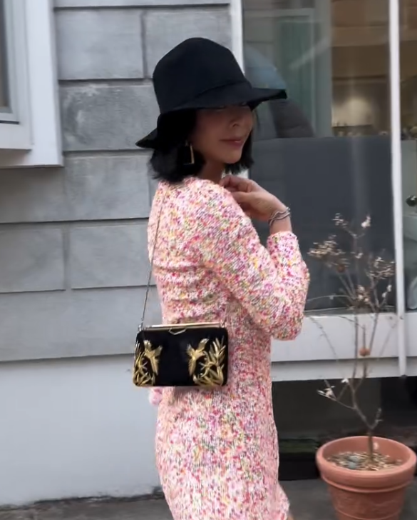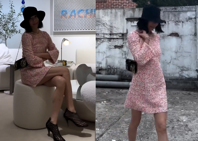 이혜영은 핑크색 꽃원피스를 입고 우아한 페미닌룩을 선보였습니다. 원피스는 부드러운 핏과 꽃무늬로 여성스러움을 강조했고, 블랙 미니백과 블랙 구두로 세련된 분위기를 더했습니다. 또한, 블랙 모자를 써서 럭셔리하고 우아한 느낌을 한층 더했습니다.
