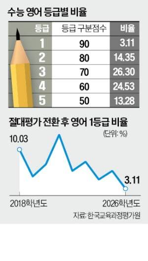 2026학년도 대학수학능력시험 채점 결과 절대평가로 치러진 영어에서 90점 이상으로 1등급을 받은 학생이 3.11%에 불과한 것으로 나타났다. 교육과정 범위와 수준을 넘어선 불필요한 학습과 사교육비 부담을 낮추기 위해 영어영역을 절대평가로 전환한 취지가 무색해졌다는 비판이 나온다.