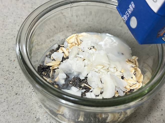 우유나 두유를 넣어서 내용물이 충분히 잠기도록 해주세요. 우유나 두유가 들어가야 오트밀과 치아시드가 충분히 불어나 부드럽고 먹기 좋은 식감이 됩니다.