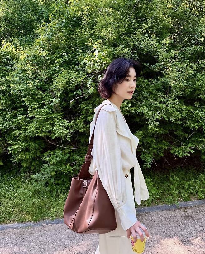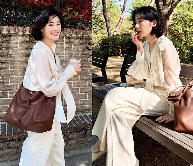 고운 주름이 잡힌 아이보리 셋업에 브라운 빅 숄더백을 매치한 정은채는 부드럽고 여유로운 무드를 고스란히 담아냈습니다.