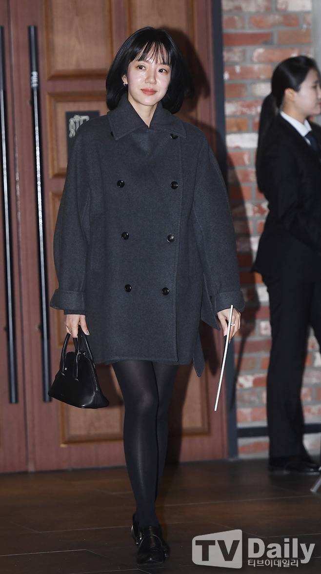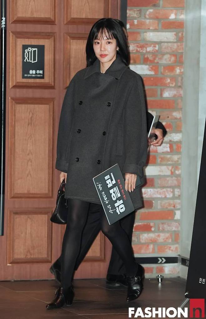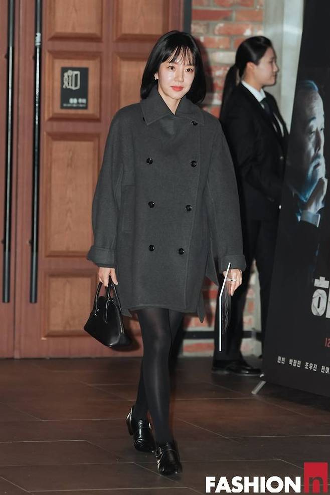 임수정은 짙은 그레이 더블 버튼 코트,