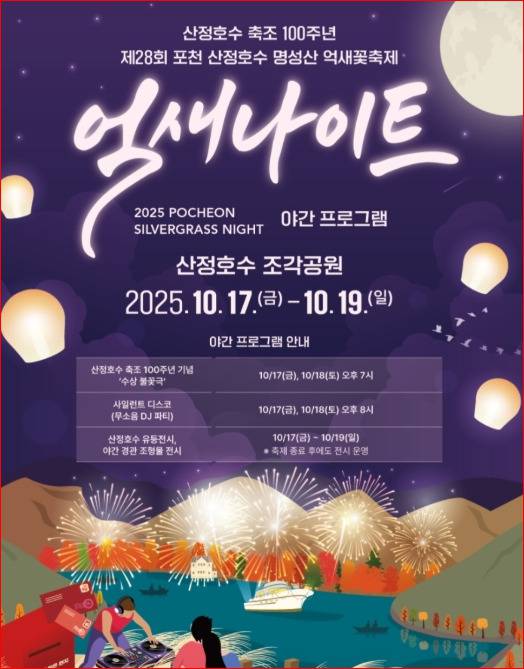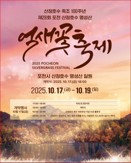 올해 축제는 **10월 17일(금)부터 19일(일)**까지 3일간 열리며, 낮에는 억새 산행을, 밤에는 산정호수의 다양한 문화 프로그램을 함께 즐길 수 있습니다.