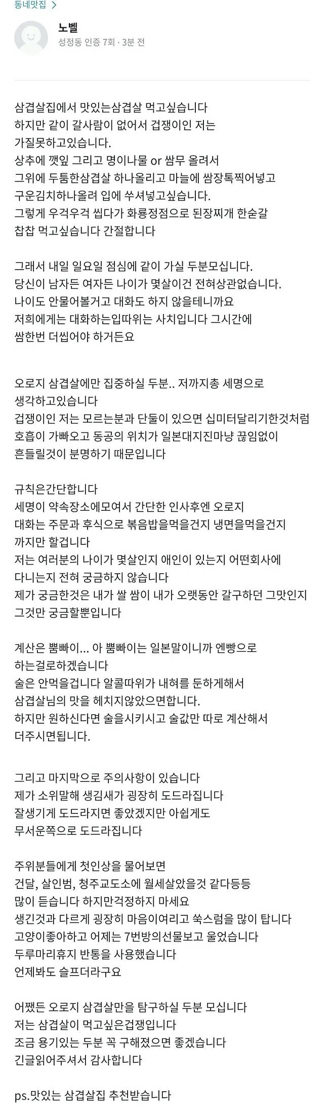 당근마켓에서 삼겹살 파티 구하는 사람