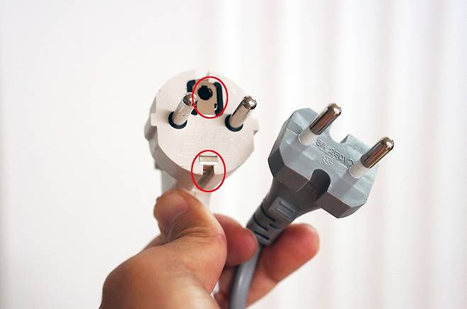 멀티탭에 접지 기능이 있는지는 딱 두 가지로 확인할 수 있다. 먼저 벽면 콘센트에 연결하는 플러그 상하단의 접지부다. 위 사진과 같이 위아래로 금속 재질 접속면이 있다면 접지 기능이 내장된 멀티탭이라는 말이다. 당연히 금속 재질 접속면이 없다면 접지 기능을 제공하지 않는다는 말이다.