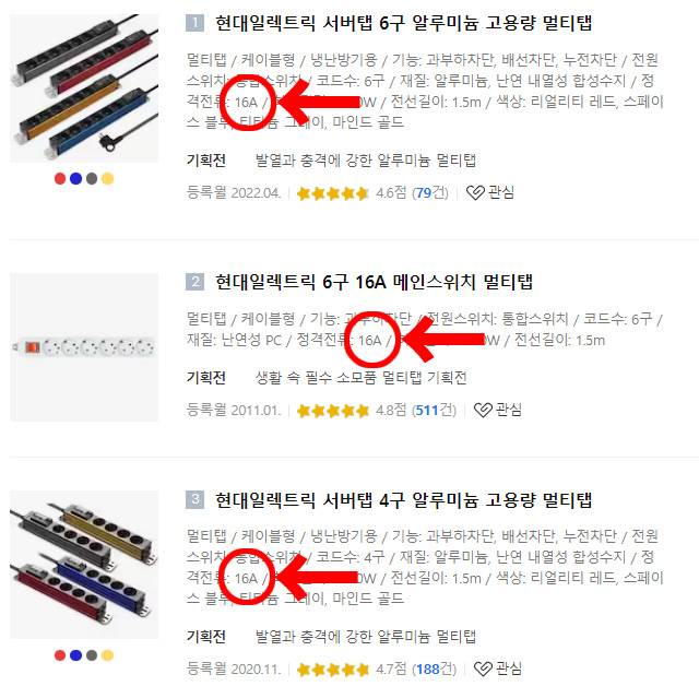 그래서 멀티탭 구입의 첫단계는 정격전류 확인이다. 온라인 구매는 상품페이지에 명시된 정격전류를 확인하면 되고, 직접 보고 살땐 멀티탭 뒷면에 나오는 내용을 참고하자. 정격전류, 혹은 정격이라 해서 A로 표시된다. 보급형은 10A, 많이 팔리는 건 16A가 대다수다. 가정용이 아닌 산업용은 30A 제품도 존재한다. 이렇게 정격전류를 파악하게 되면 정격용량 계산을 할 수 있게 된다. 정격 용량 공식은 다음과 같다.