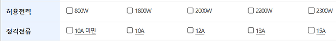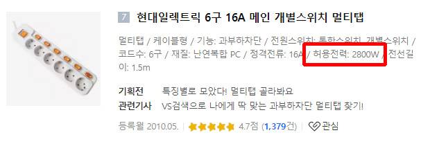 다나와 상품리스트에선 허용전력이라 표기한다. 2800W라함은 해당 멀티탭에 소비전력 2800W까지 연결해 사용할 수 있다는 말이다. 말 그대로 허용한다는 것. 소비전력은 전기를 연결해 사용하는 제품이라면 의무적으로 표시하게 되어 있다. 우리 주위의 가전 제품의 대략적인 소비전력은 다음과 같다.