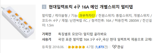 더불어 이런 개별 차단 스위치가 달린 제품 중에는 과부하 차단 기능이 탑재된 제품도 있다. 이는 사용 중 정격용량(15A, 250V) 이상의 과부하가 걸리면 자동으로 전원을 차단시키는 기능이다. 멀티탭 내부에 일종의 퓨즈가 장착되어 과부하가 걸릴 경우 이를 차단해 준다. 개별 차단 스위치가 달린 멀티탭을 구입할 계획이라면 이 과부하 차단 기능을 확인해 주는 것이 좋다. 과부하 차단 기능만 있어도 적어도 화재의 압박에서는 어느 정도 마음을 놓을 수 있다.